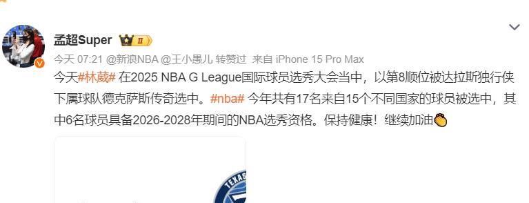 北京时间7月9日三星证券,NBA G联赛国际球员选秀,中国球员林葳被达拉斯独行侠下属球队德克萨斯传奇队在第八顺位选中。今年有17位国际球员被选中远高于去年,林葳也终于获得海外联赛征战的资格,南京同曦发来贺电。