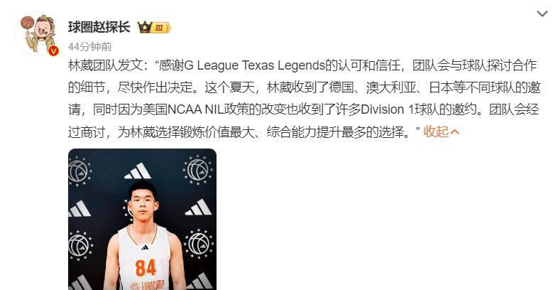 赵探长也发文——林葳团队感谢德克萨斯传奇队的认可三星证券,团队与 球队会弹跳合作细节希望尽快做出决定。【林葳团队除了考虑NCAA D1球队之外还有德国、澳大利亚、日本等不同联赛球队的可能性,想选择对林葳锻炼价值最大、综合能力提升最大的那支】