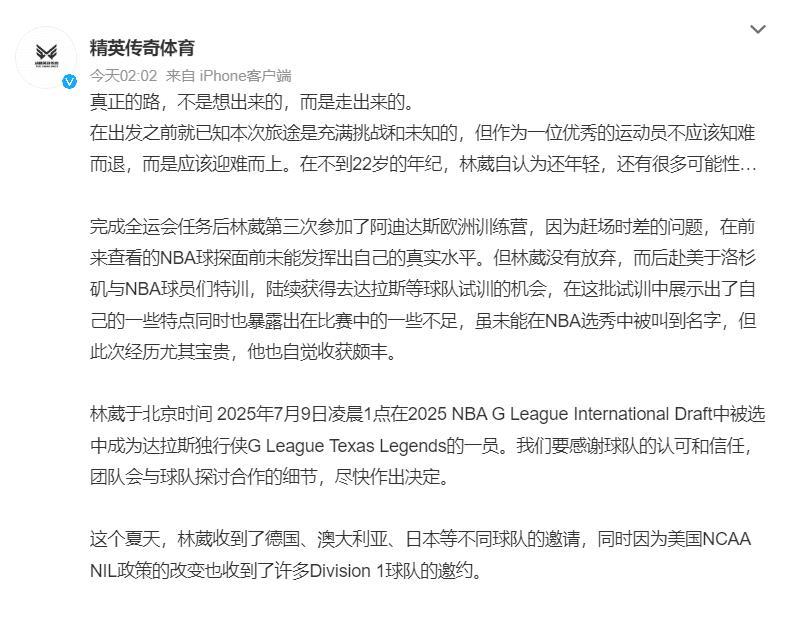 林葳刚刚被德克萨斯传奇队在第八顺位选中,感谢球队的认可和信任,团队会与球队探讨合作的细节尽快作出决定。这个夏天,林葳收到了德国、澳大利亚、日本等不同球队的邀请,同时因为美国NCAA NIL政策的改变也收到了许多Division 1球队的邀约。团队会经过商讨,为林葳选择锻炼价值最大、综合能力提升最多的选择。